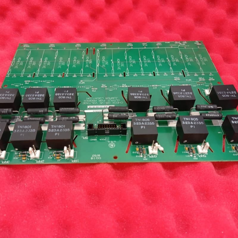 Physically, it includes four adjustable labeled jumpers for customization, plus snubber circuits and pulse transformers for voltage protection. Installation requires drive power-off; downtime is recommended for maintenance per GE guidelines.